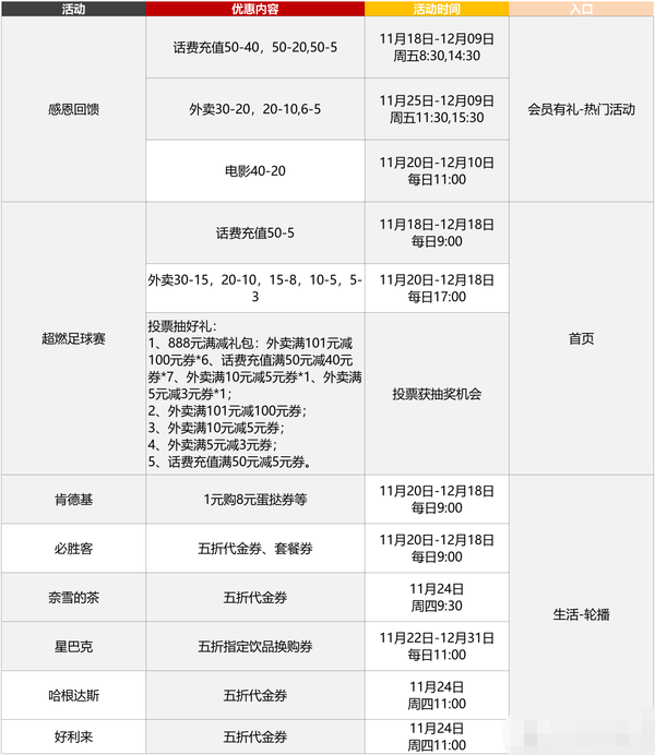 1、话费:【11月18日-12月18日,每日9:00】满50-5,一共可以领2张。