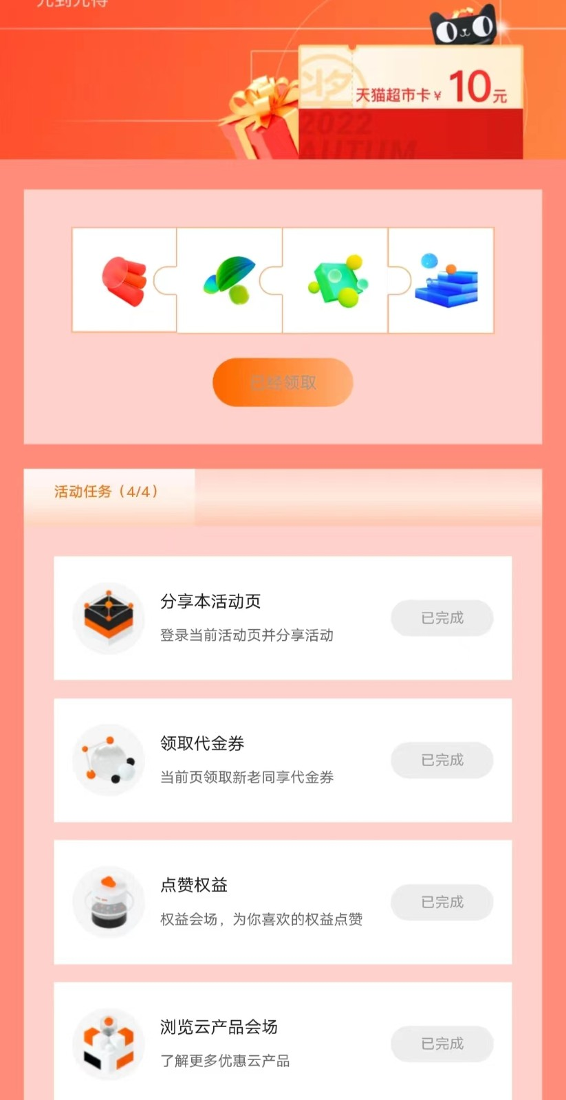 3、完成后回到活动里领取10元天猫超市卡,按照提示填写淘宝信息领取,领取后活动结束30个工作日到账,以往阿里云的猫超卡都到账了,所以这个活动建议参加一下