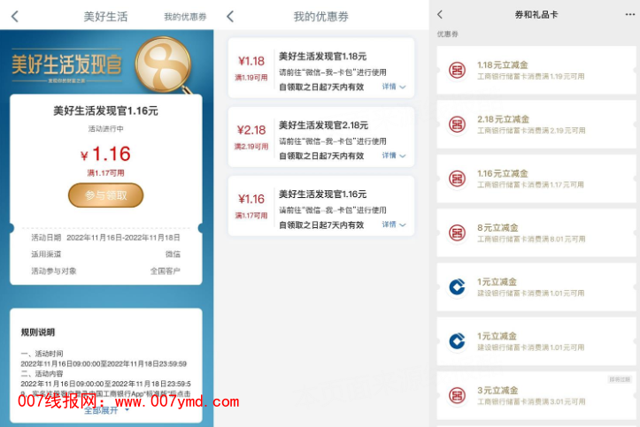 浏览器依次打开地址->跳转到工行APP分别领取1.16+1.18+2.18+11.18元立减金->今天没名额了!可以提前保存,等明天再去领!