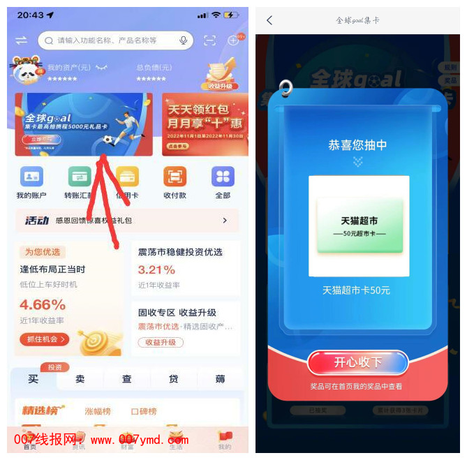 打开浦发银行APP首页顶部“全球goal集卡最高抽携程5000元礼品卡”进入活动