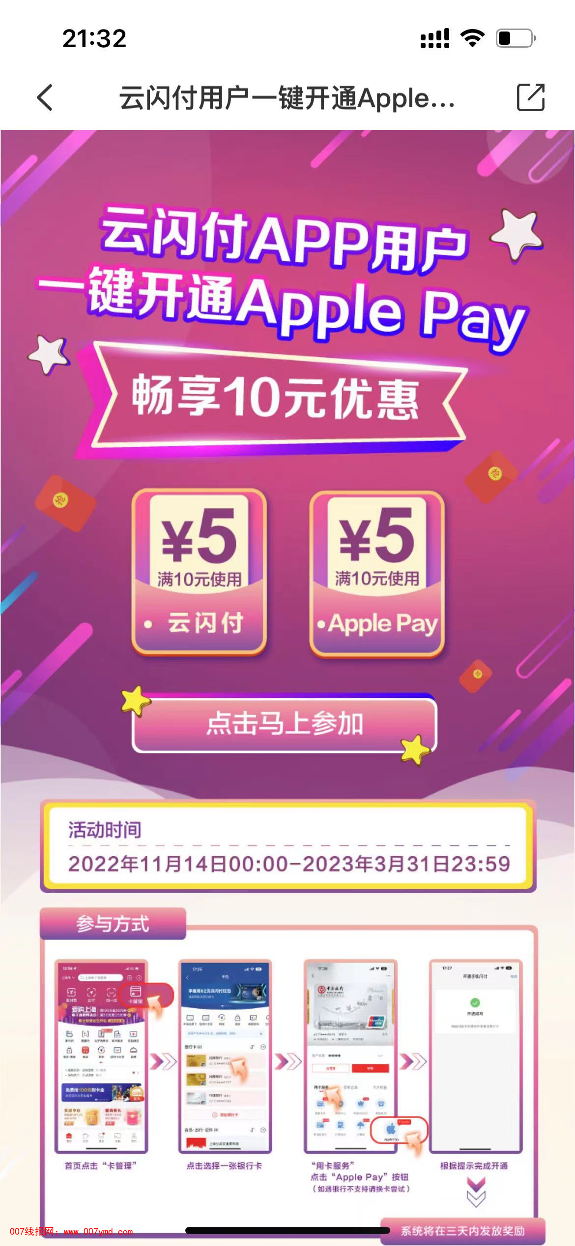 4、这个仅限苹果用户开通Apple Pay功能可以获得2张5元立减消费券,3个工作日到账