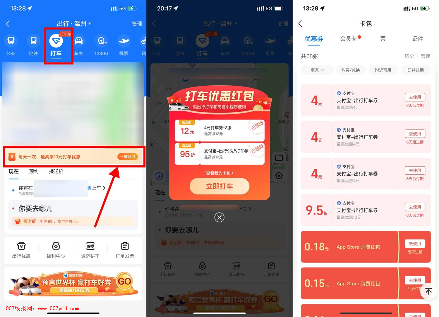 支付宝APP首页“出行”->顶部“打车”->点击横幅每天领随机打车券->这个券支付时才显示抵扣,可叠加高德原本的打车券