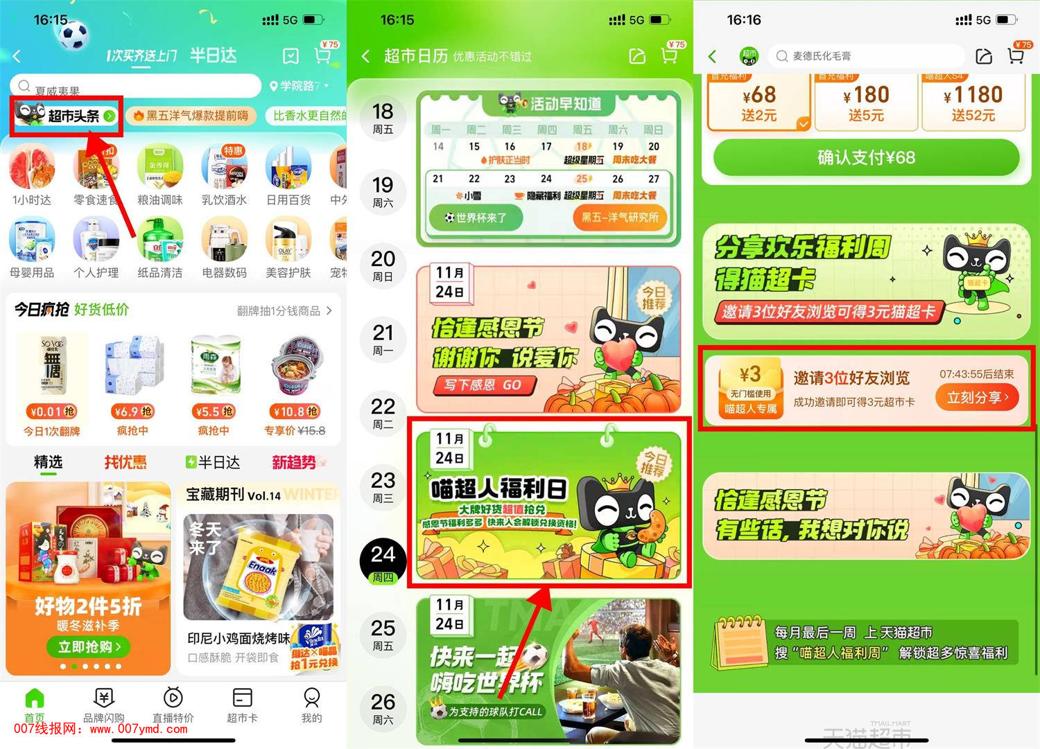 淘宝APP首页“天猫超市”->顶部“超市头条”->喵超人福利日->下拉邀请3人浏览领3元天猫超市卡