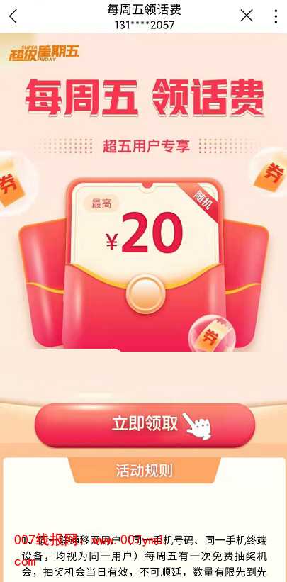 联通超级星期五领最高20元话费 秒到,好像现在的超五没有视频网会员那些了