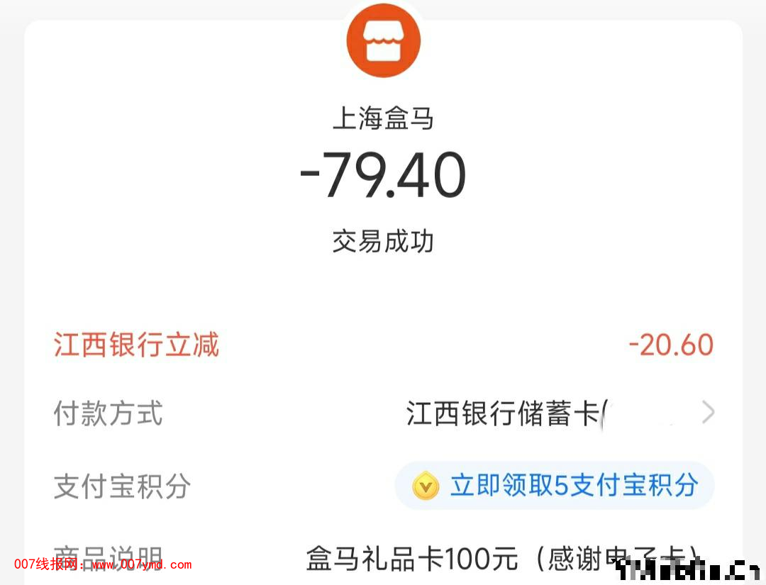 江西银行盒马支付满99随机减20-30元优惠(可礼品卡)
