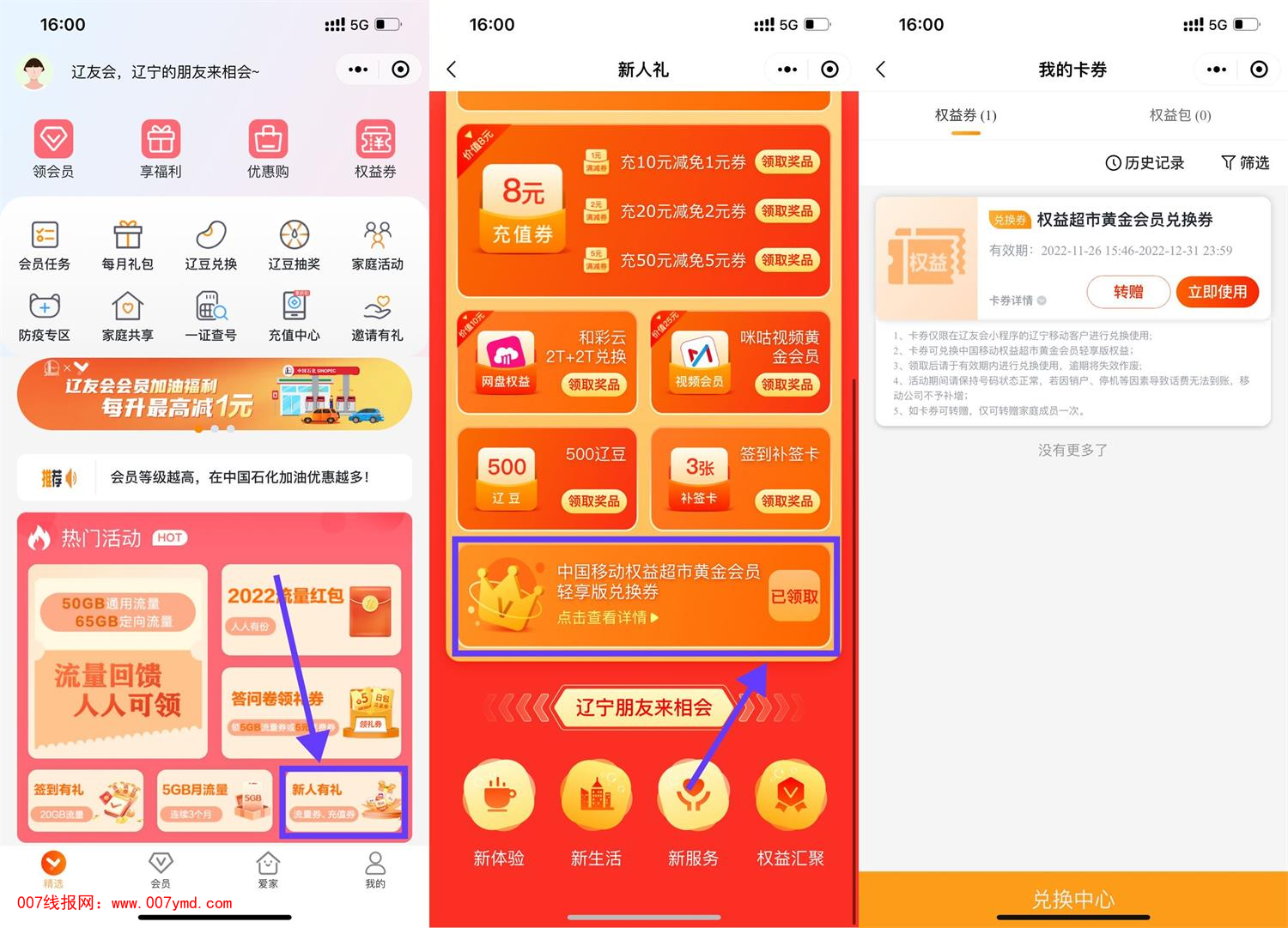 微信进入小程序“辽友会”->新人有礼->下拉领取超市权益黄金会员->返回小程序我的卡券中兑换->每个月可免费领取5元天猫超市卡