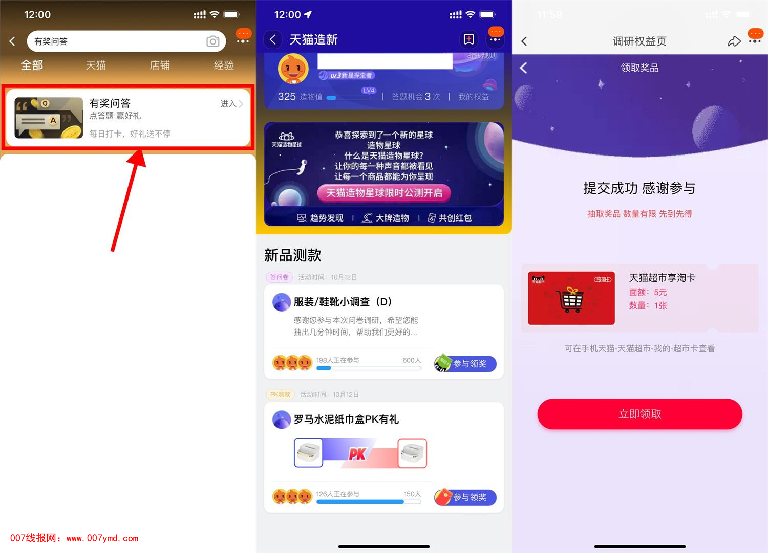 手机淘宝APP->搜索“有奖问答”->点击横幅进入->下拉页面精选活动->参与评测赢红包或猫超卡->回答完之后自动抽奖