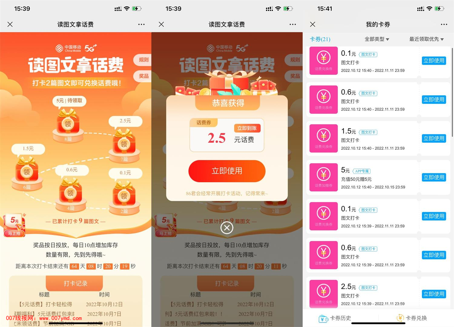 2、进去后有提示打卡成功->返回继续下个链接->都打卡完了->手动点图上话费领取->再点奖品->依次兑换即可!