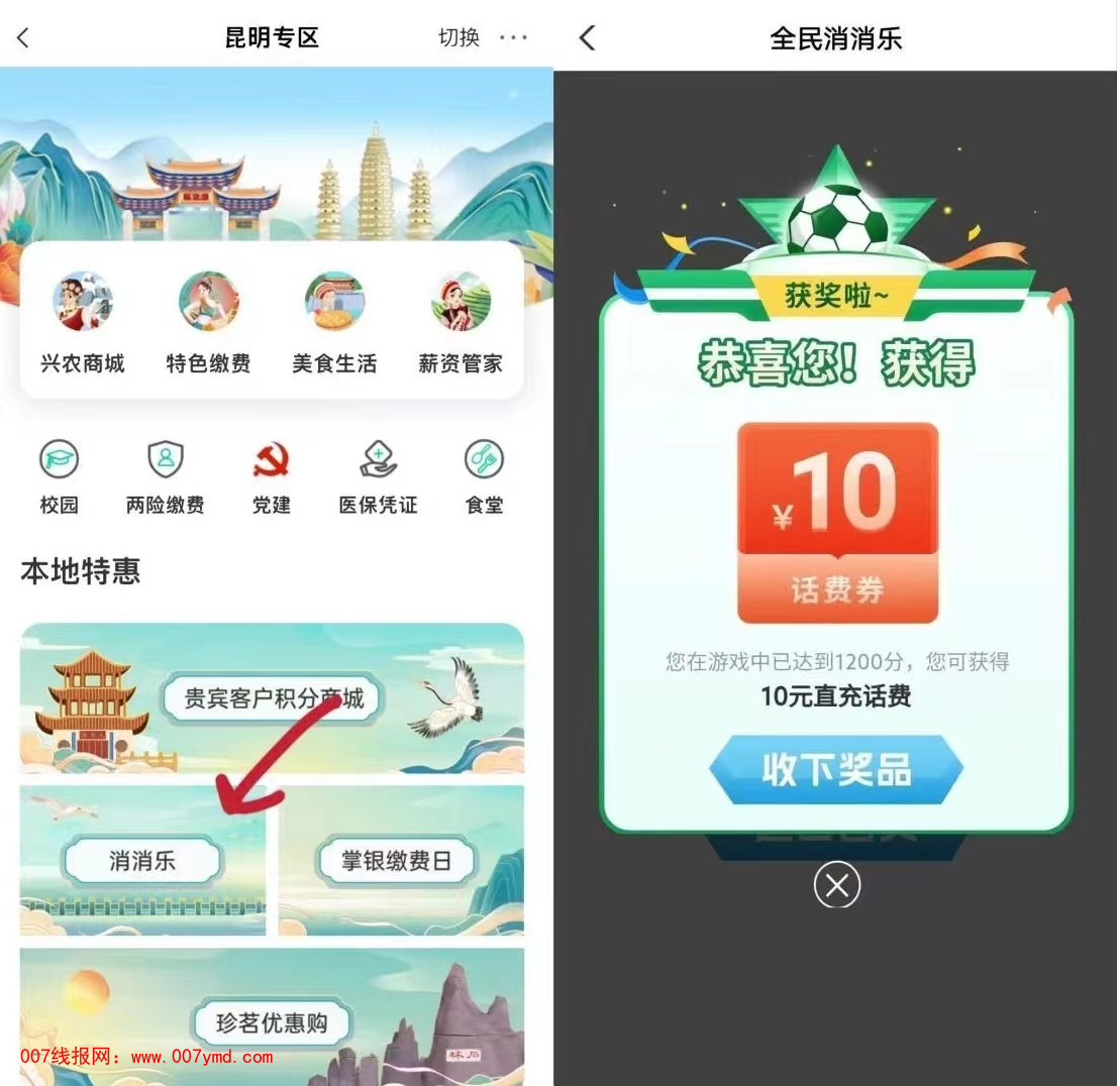 2、再去农业银行APP搜索【城市专区】在右上角修改【昆明市】-【消消乐】进入游戏