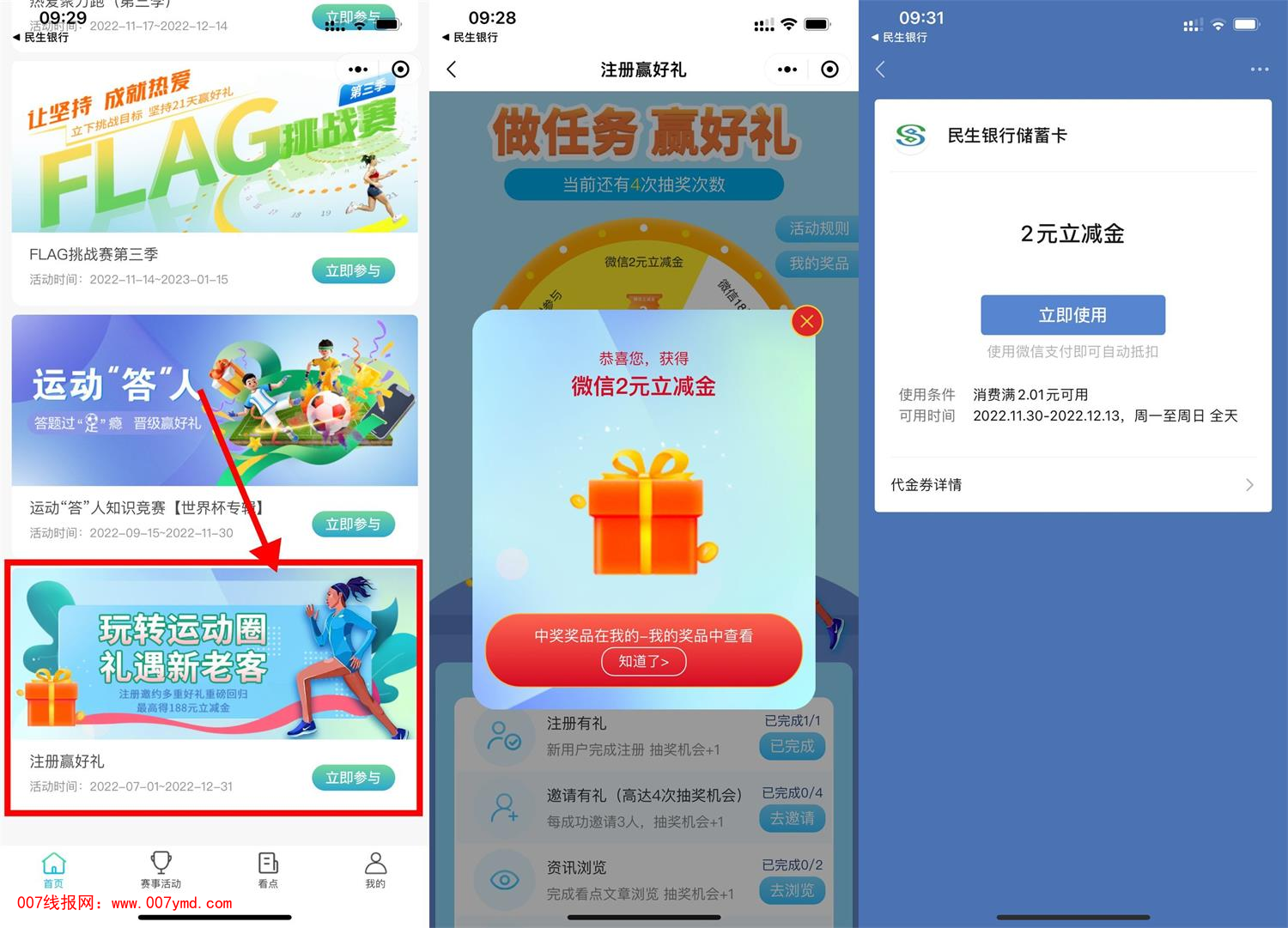 复制下方文字发送微信任意好友打开地址进入小程序“民生银行运动圈”->玩转运动圈->默认有1次机会,浏览发布得5次机会->抽中立减金在我的奖品中兑换