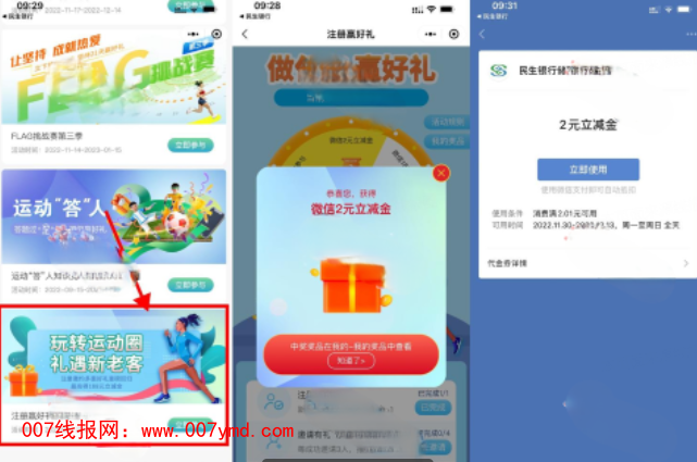 微信进入小程序“民生银行运动圈”->玩转运动圈->默认有1次机会,浏览发布得5次机会->抽中立减金在我的奖品中兑换