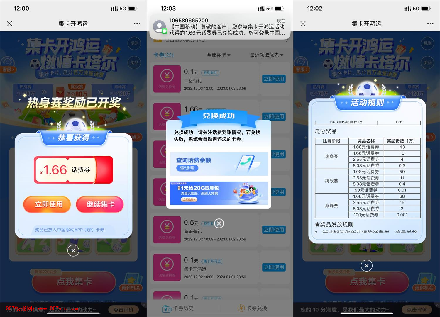 2、集满6张卡片12月11日早上8点瓜分1~50元话费券,可直接激活兑换话费