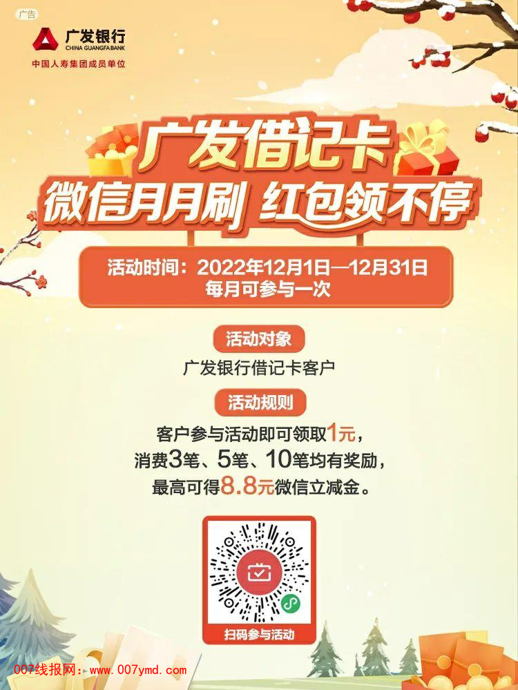 广发银行月月刷领8.8微信立减金,消费任务每天QQ大小号互发5元以上红包2次