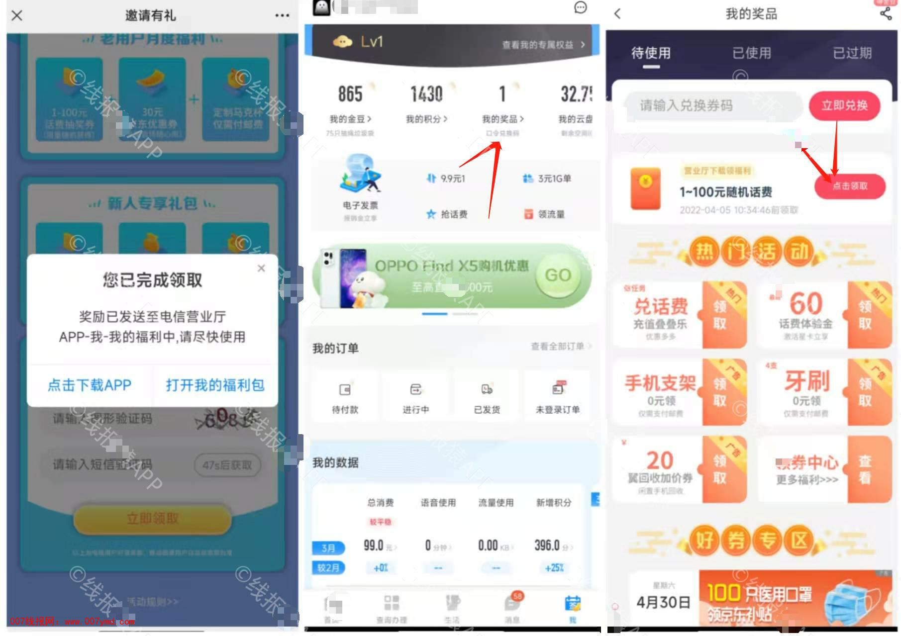 2、领到福利后,再跳转到电信营业厅APP福利中心领取话费,或者打开电信营业厅APP,在【我】页面点【我的奖品】进去领话费,一般都是中1元话费,话费48小时内到账