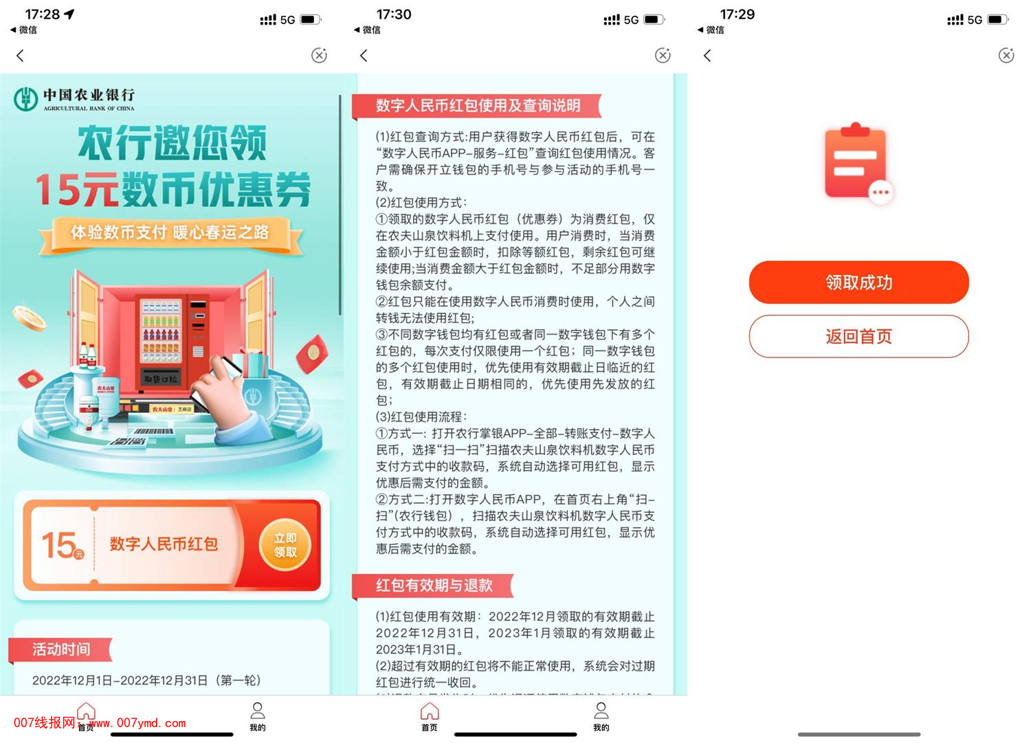 (已领完)————微信打开跳转到农行APP->直接领取15元数币红包