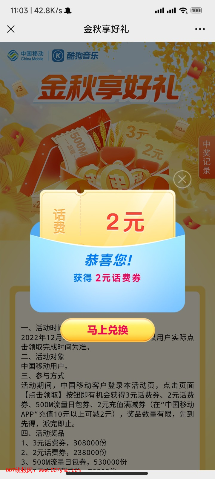 中国移动号码参加,每个账号都可以抽奖1次,有机会中到2-3元手机话费、500M流量日包,中到话费后跳转到中国移动APP卡券里面兑换领取————