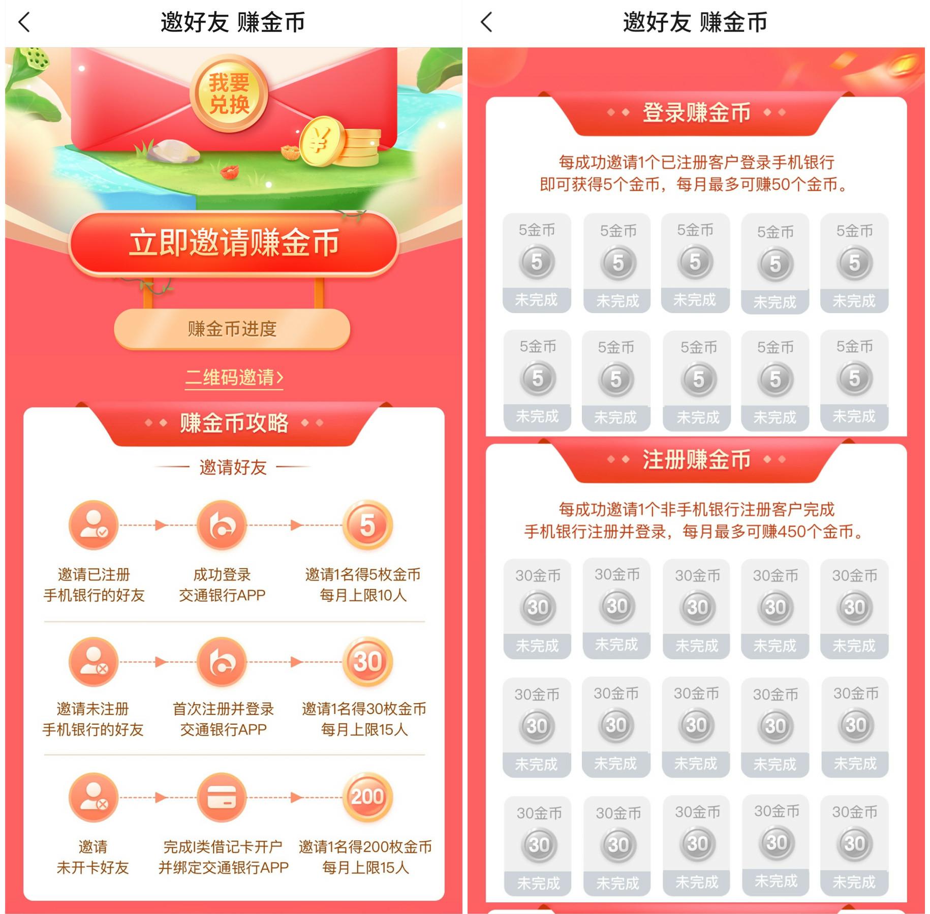 打开交通银行APP搜索【邀好友】--【邀好友 赚金币】进入活动,可以分享或二维码邀请