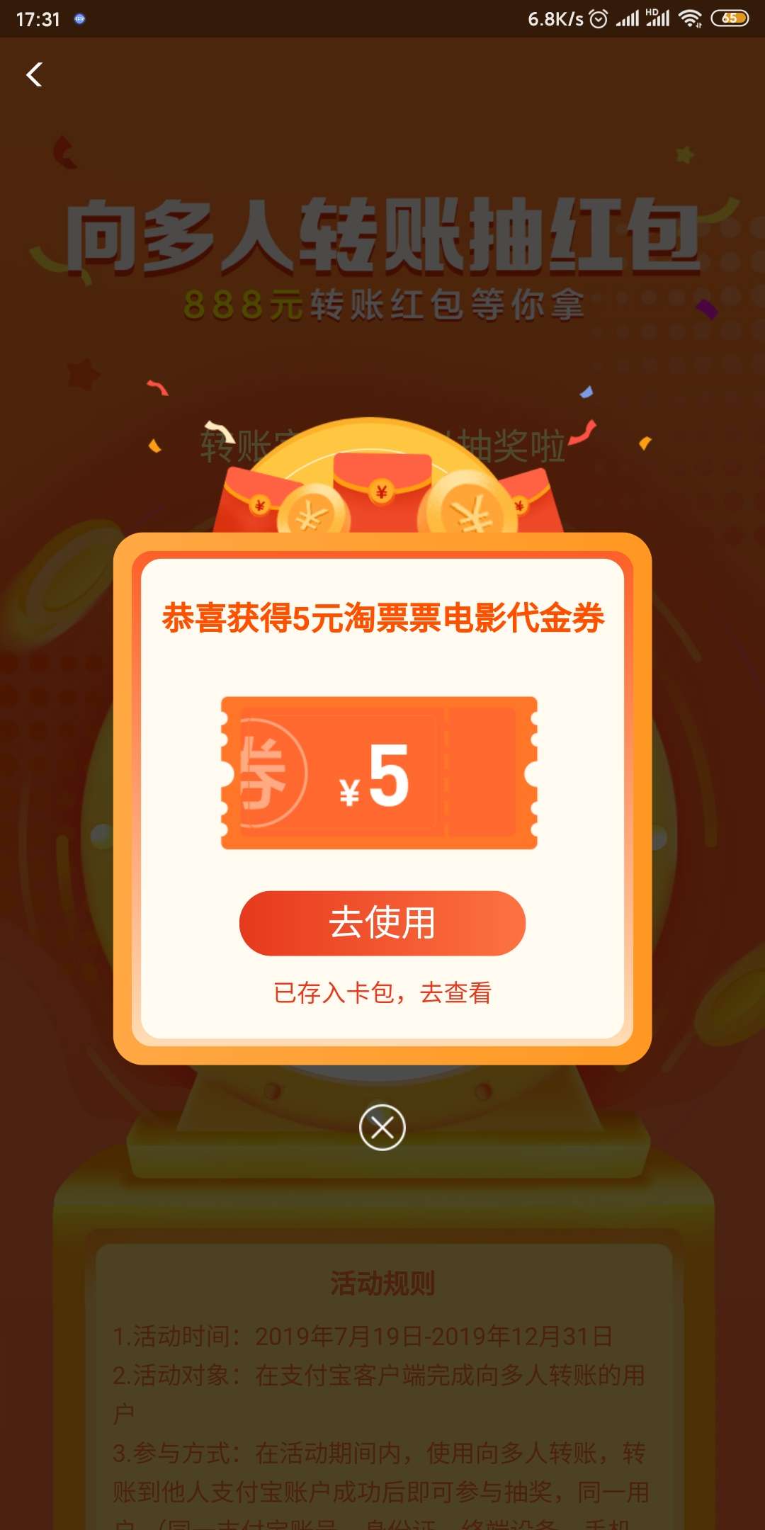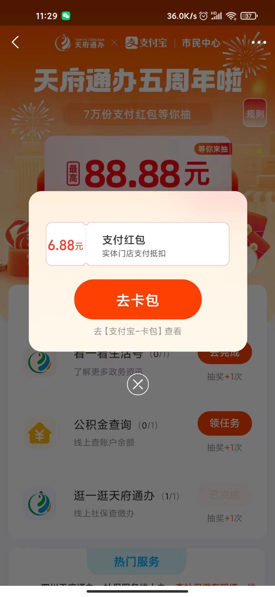 “天府通办”五周年免费送红包活动,在支付宝里完成3个简单的任务即可免费抽奖3次,可抽中一次,金额随机0.88-88元,亲测6.88元支付宝实体店红包,线下买东西可抵扣现金。