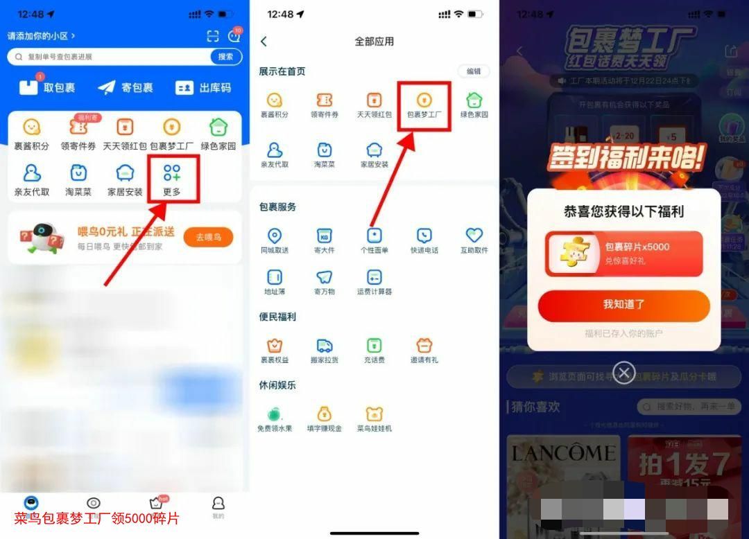 菜鸟裹裹APP->首页“更多”->包裹梦工厂->自动弹出5000碎片,可直接兑换话费券或实物或开宝箱