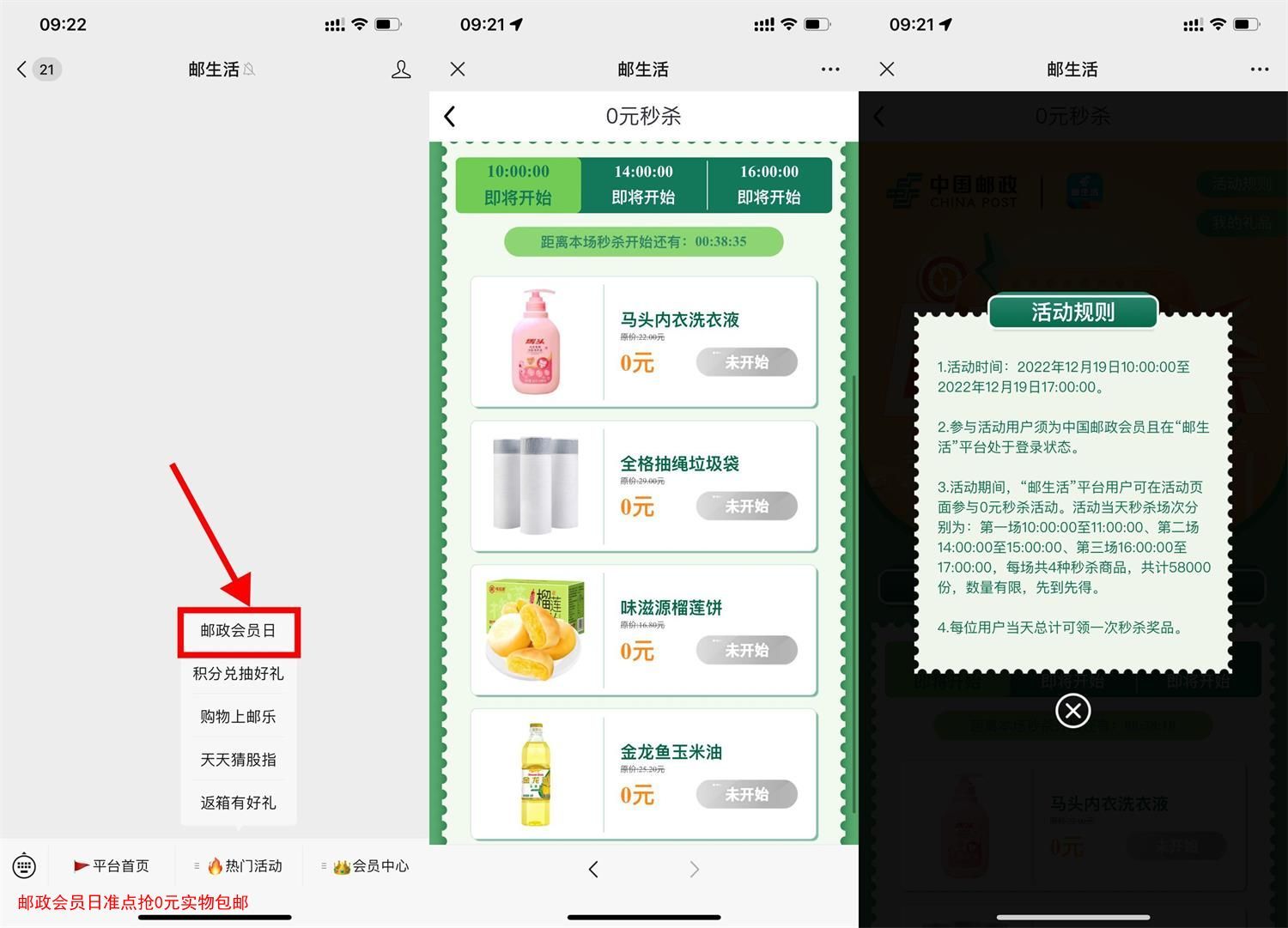 微信关注公众号“邮生活”->菜单栏“热门活动-邮政会员日”->今天10点、14点、16点准点抢实物,自己设置一个闹钟,大概2分钟内抢完