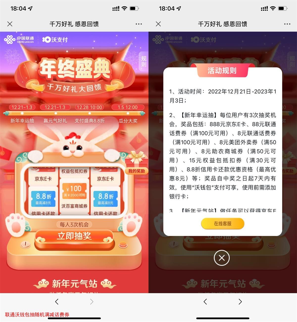 微信打开地址->默认有3次机会->抽随机京东E卡、话费券,话费券在联通APP缴费可用