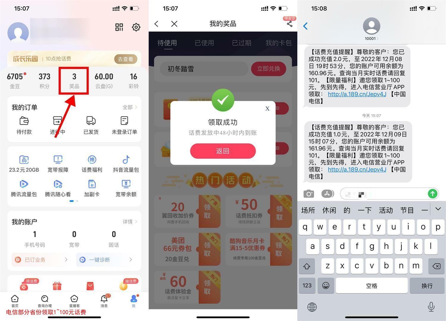 电信APP->我的->我的奖品->输入自己地区对应省份的囗令抽话费