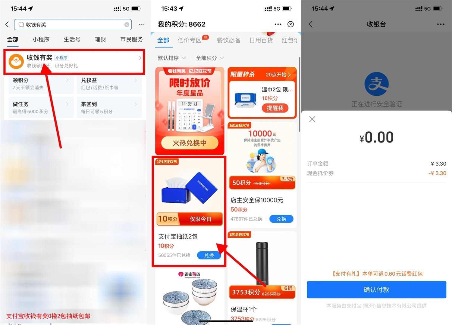 支付宝搜索“收钱有奖”->下拉找到“支付宝2包抽纸”->用10积分兑换0元下单即可!