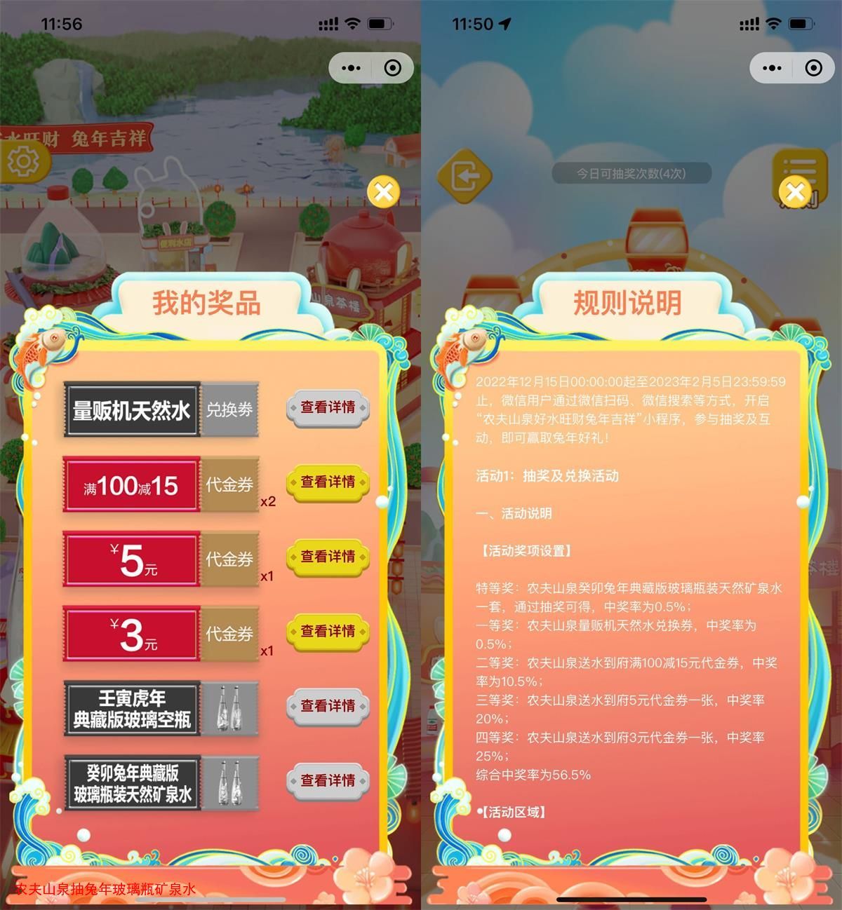复制下方文字发送微信任意好友进入小程序“农夫山泉好水旺财兔年吉祥”->每天默认3次机会+浏览得4次机会->抽中玻璃瓶天然矿泉水填写地址领取等邮寄就可以了