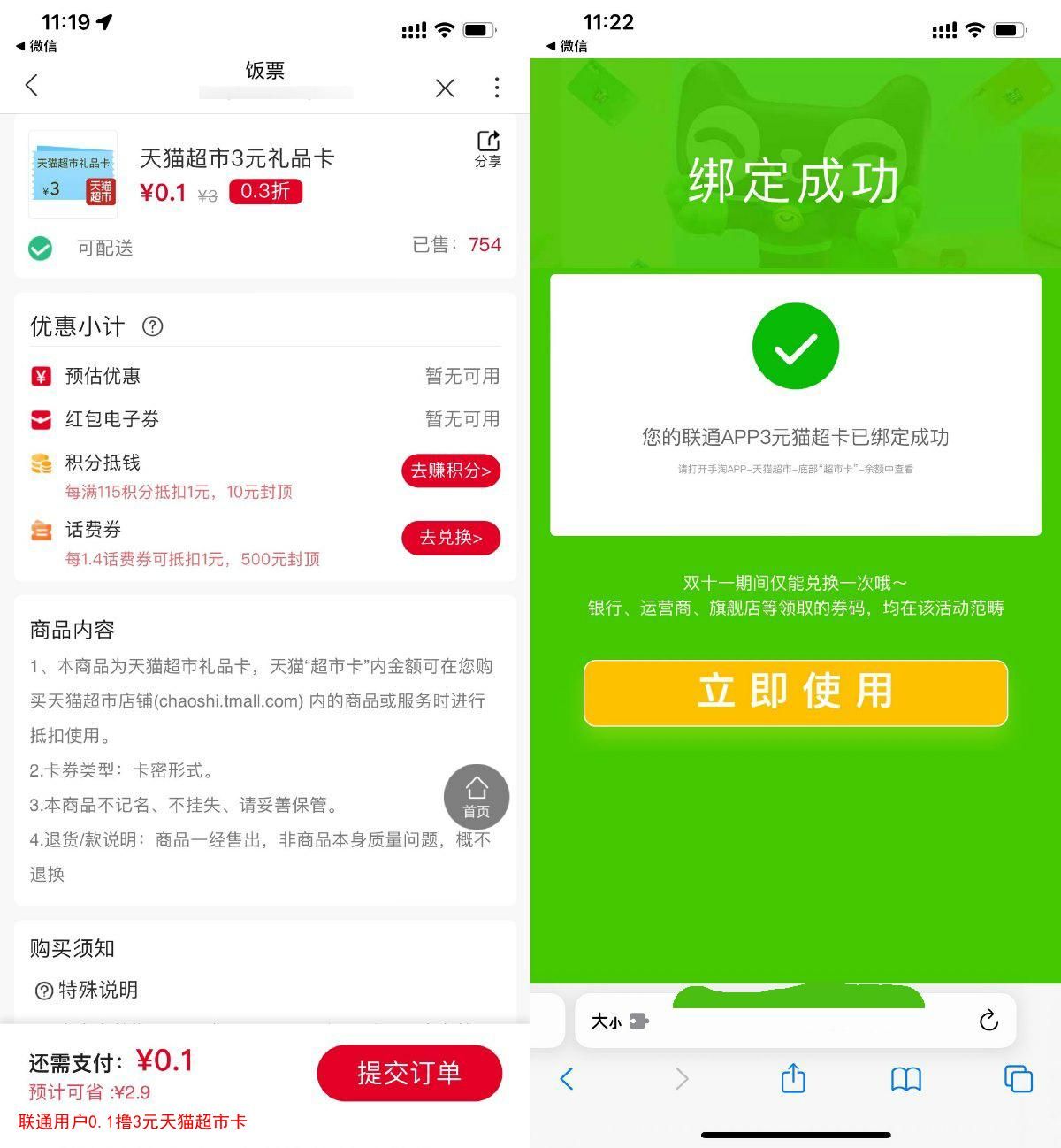 打开地址跳转到联通APP->0.1元买3元天猫超市卡->复制兑换码打开兑换地址兑换