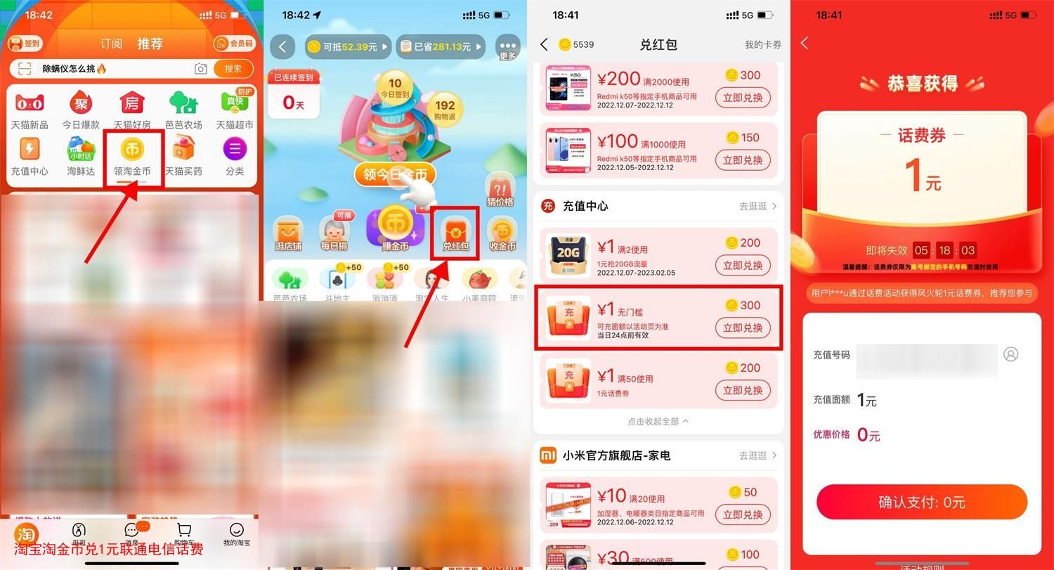 淘宝APP首页“淘金币”->兑红包->下拉使用300淘金币兑换1元话费券,直接使用秒到