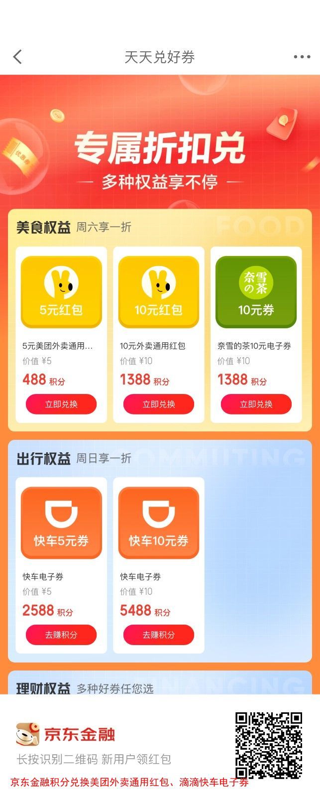 京东金融积分兑换美团外卖通用红包、滴滴快车电子券