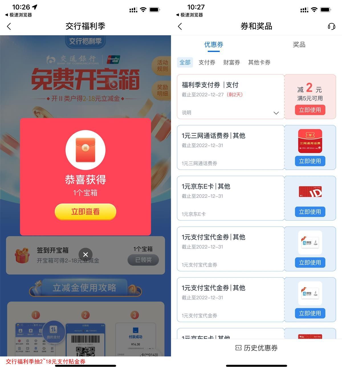 打开地址跳转到交行APP->直接开宝箱->在我的奖品中查看->贴金券扫银联码即可抵扣