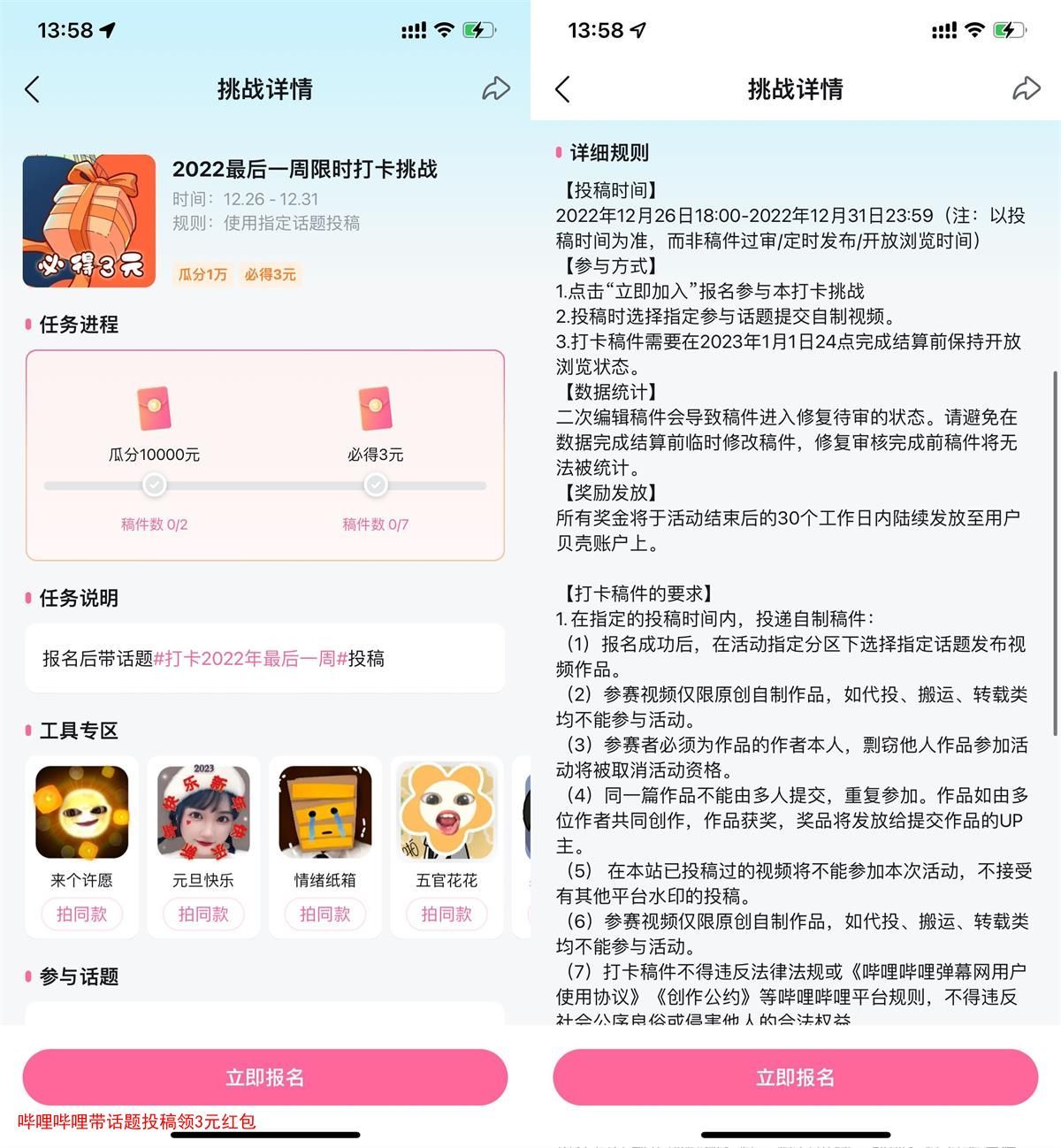 哔哩哔哩APP扫码->报名后根据页面提示带上话题投稿7个视频->瓜分1万元红包+必得3元红包