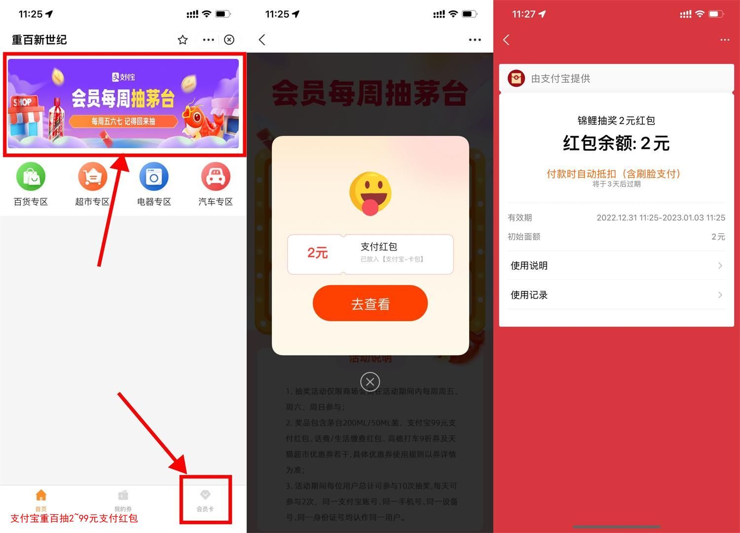 支付宝搜索“重百”->右下角领取会员卡->首页横幅进入抽2~99元支付红包或茅台酒,每天2次机会!