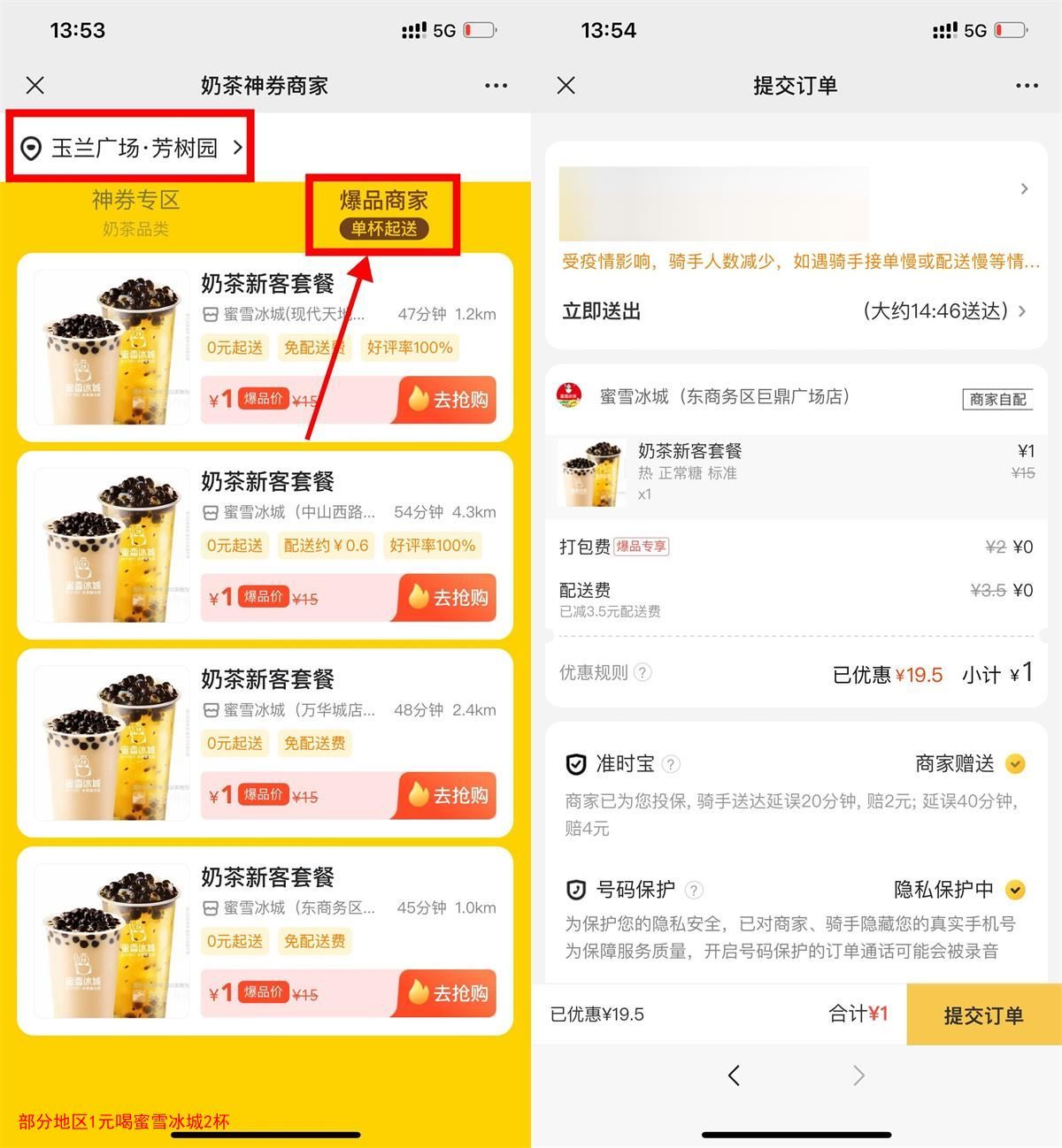 微信打开地址->左上角选择自己的地址->爆品商家,能看见很多1元蜜雪冰城,可以无限买,免费配送到家(如果页面显示空白就代表你那个地区没有活动商家)