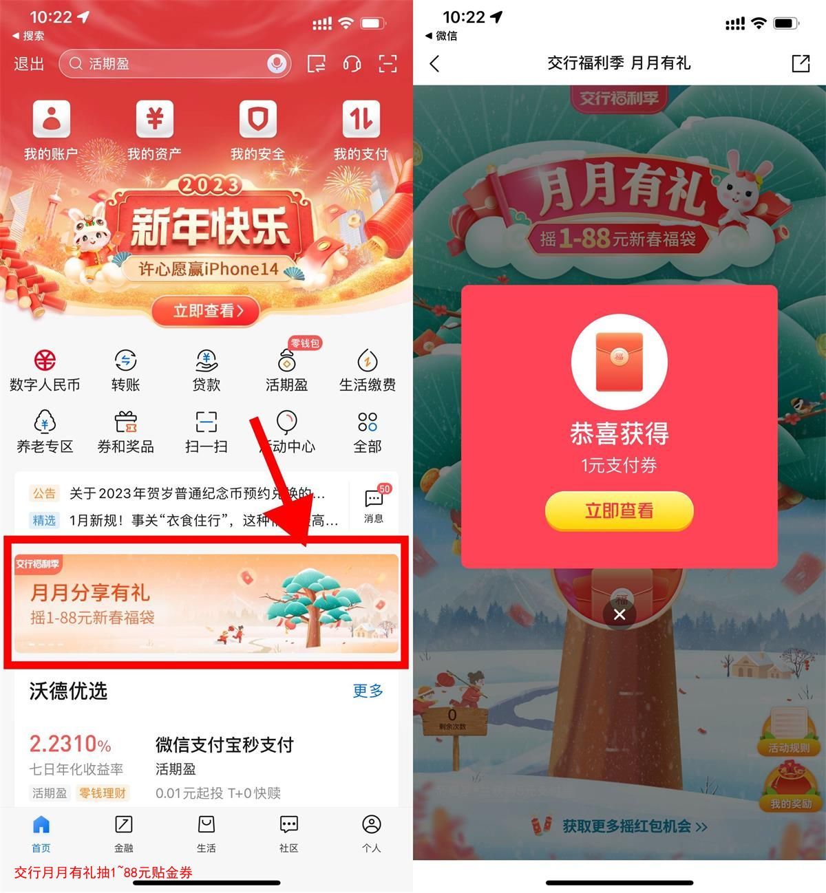 交行月月有礼抽1~88元贴金券
