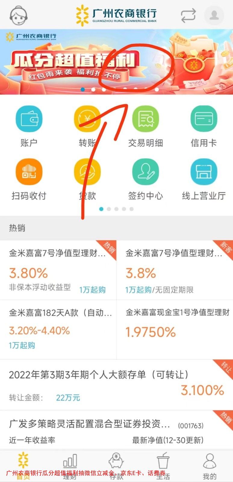 下载广州农商银行APP在首页顶部“瓜分超值福利”进入参与一次抽奖,分享好友额外获得1次游戏次数