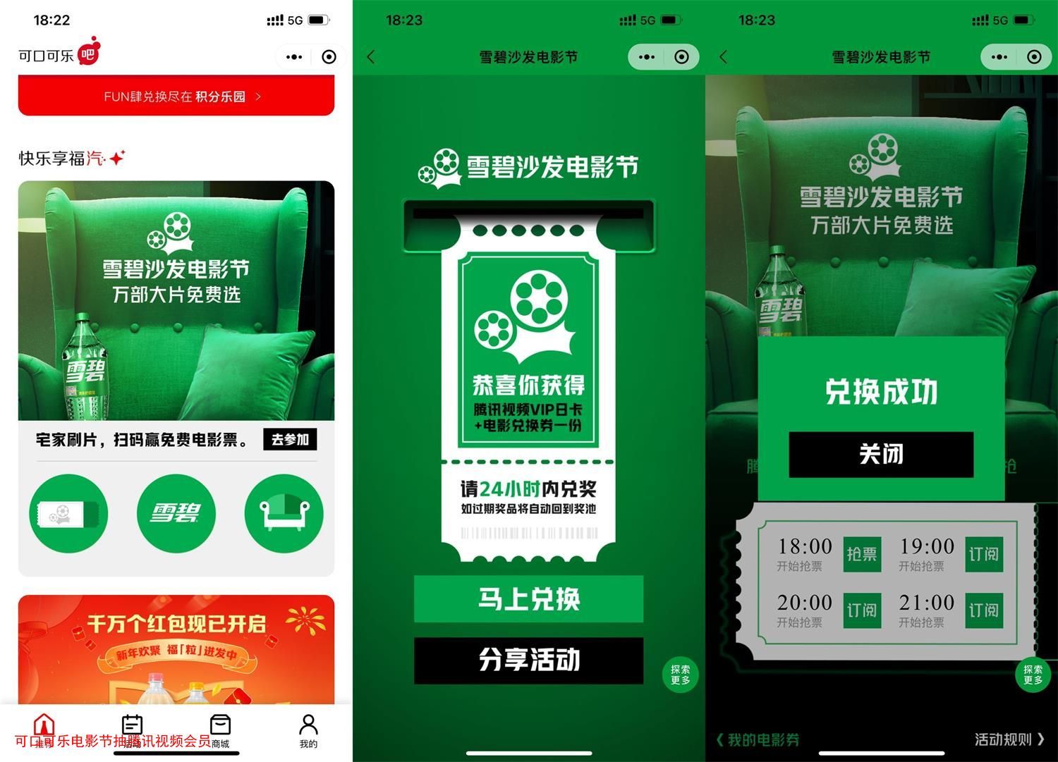 微信进入小程序“可口可乐吧”->下拉“雪碧沙发电影节”->随便上传一张照片抽腾讯视频会员