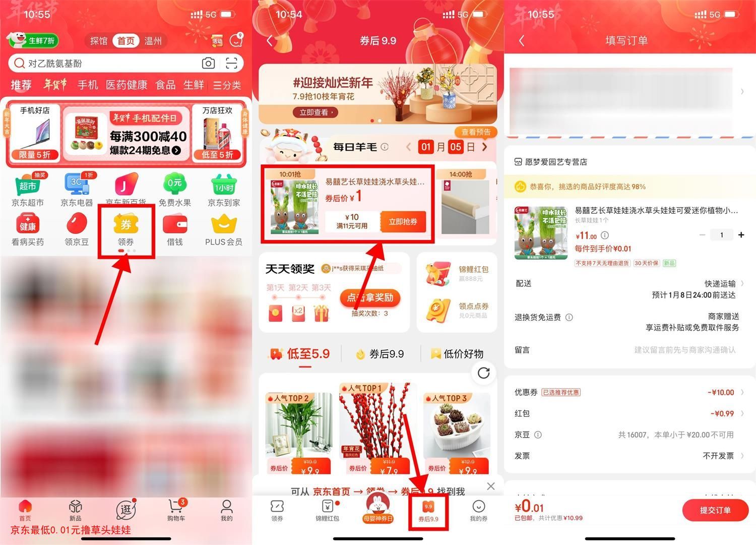京东APP搜索“抢红包499”领个随机红包->首页“领券”进入底部“券后9.9”能看见1元草头娃娃,抵扣红包后最低0.01元包邮到手