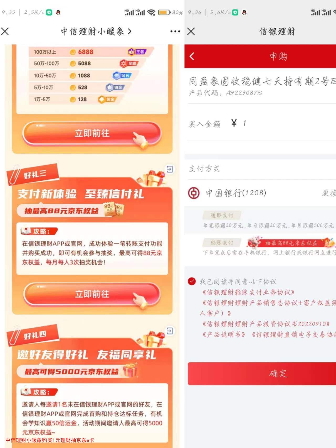 中信理财小暖象购买1元理财抽京东e卡