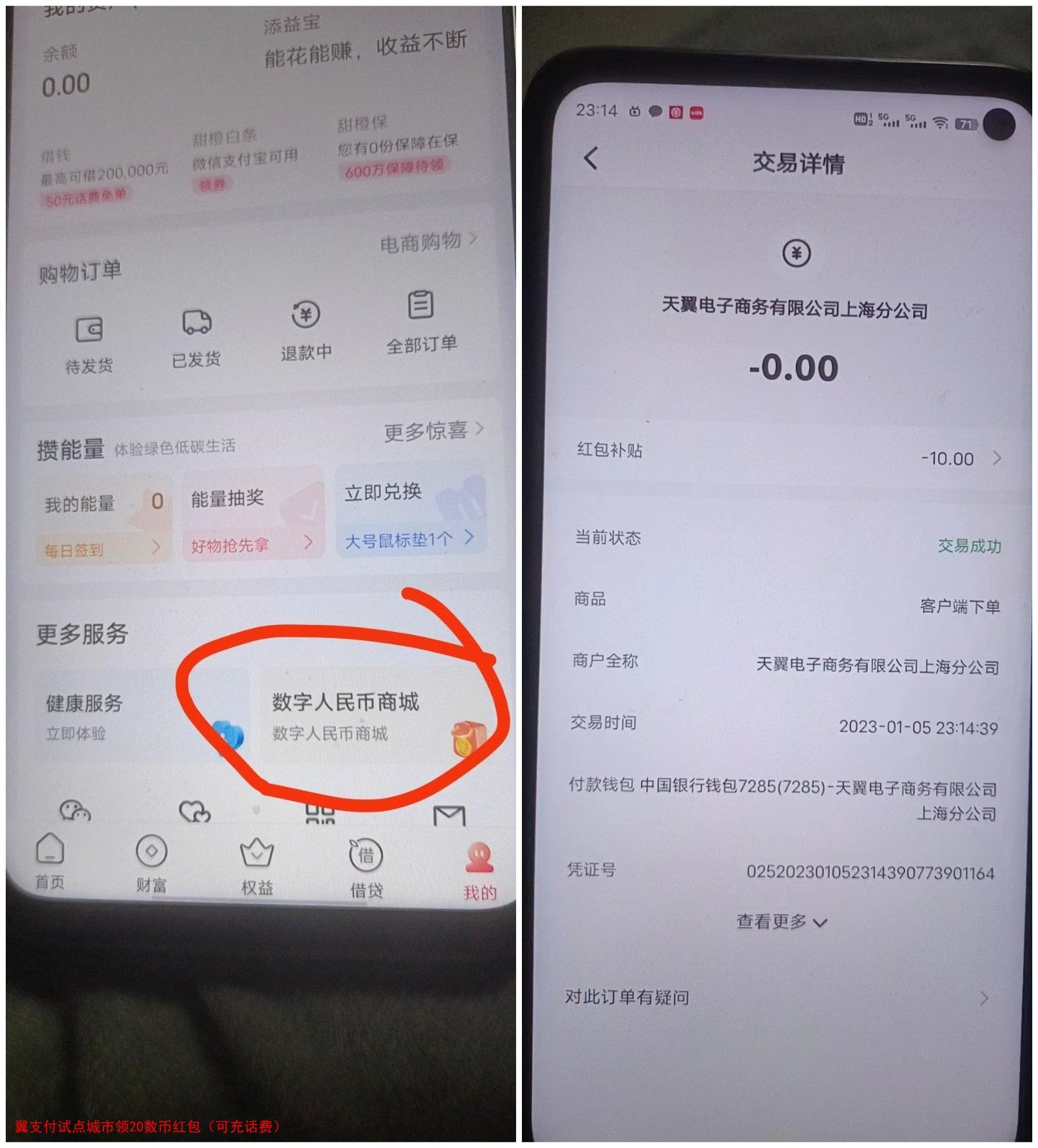 数币试点地区,电信号登录翼支付,搜数字人民币,弹窗报名领两个10数币红包。一个本月可用一个下月可用,数币商城充话费10全额抵扣。