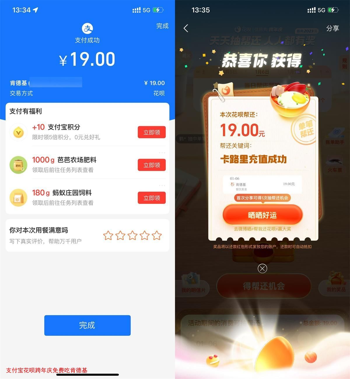 支付宝搜索“肯德基”,使用花贝点20亓以内的到店“预约”单->然后支付宝搜索“花呗帮还”抽奖,目前大概率中帮还资格!(如果没抽中取消肯德基的预约单就行了)