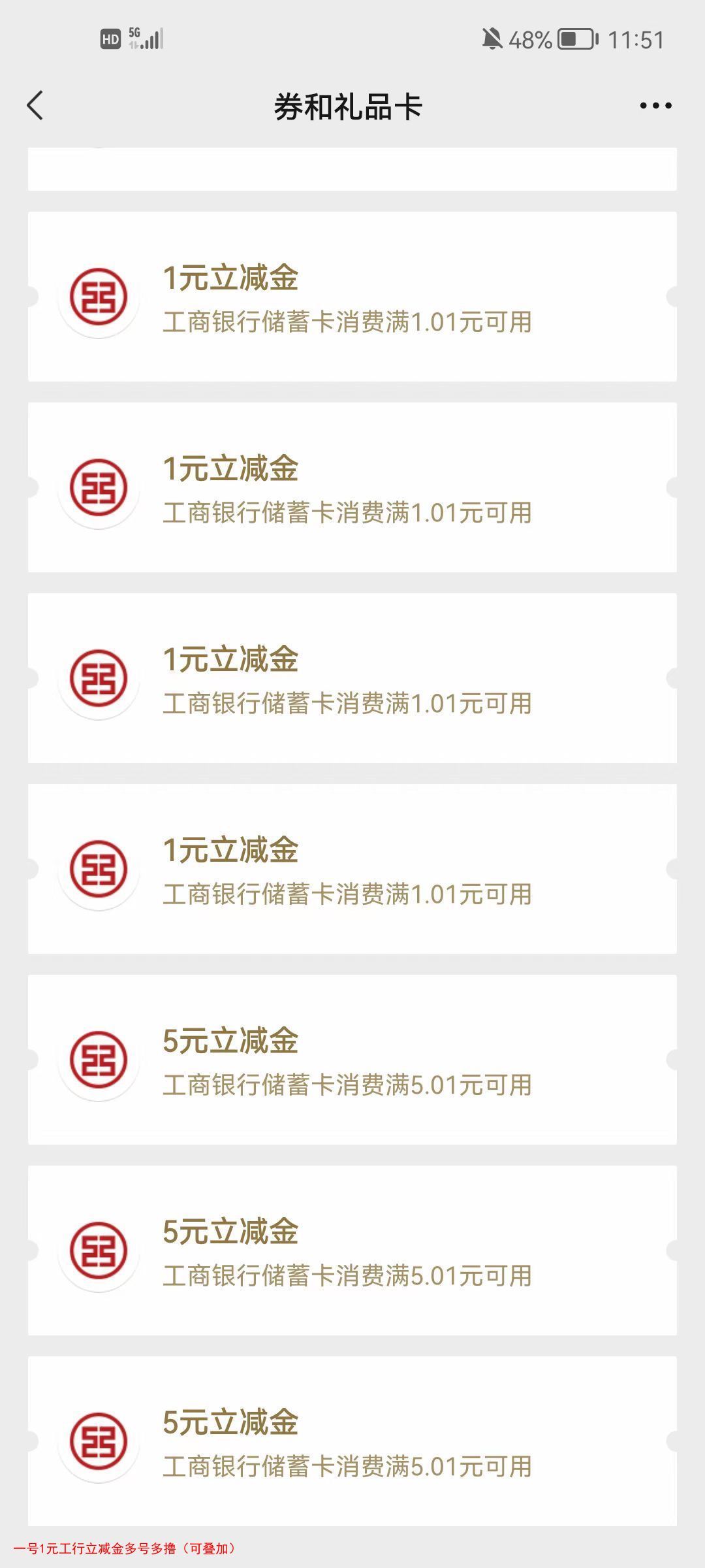 一号1元工行立减金多号多撸(可叠加)