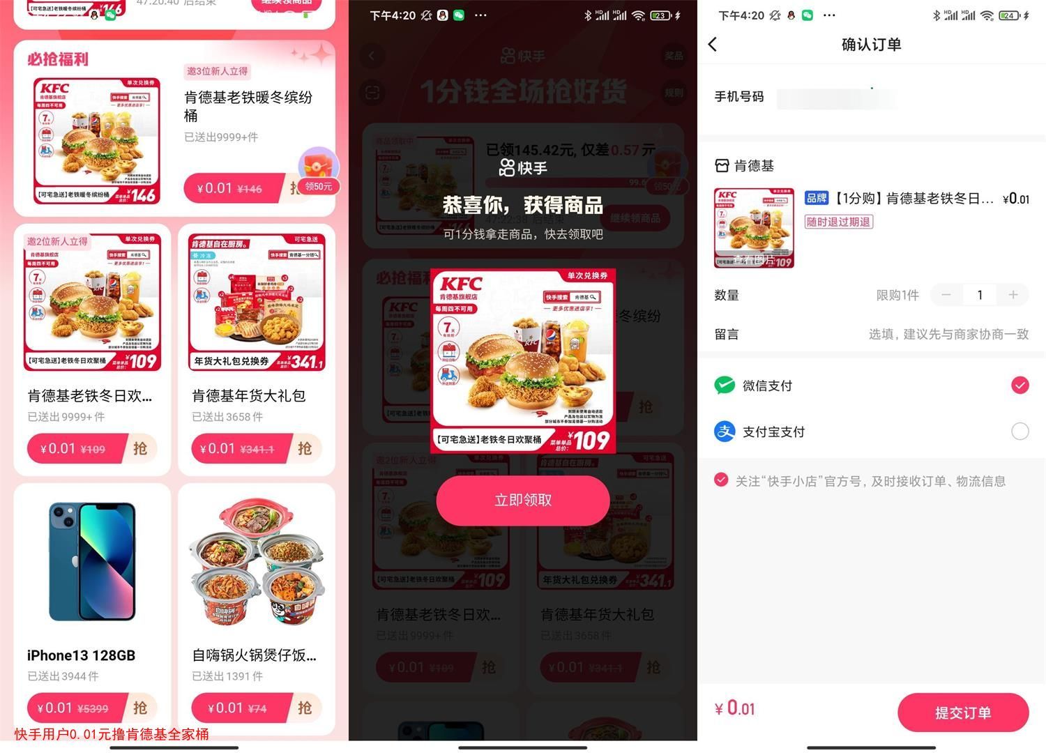 快手用户0.01元撸肯德基全家桶