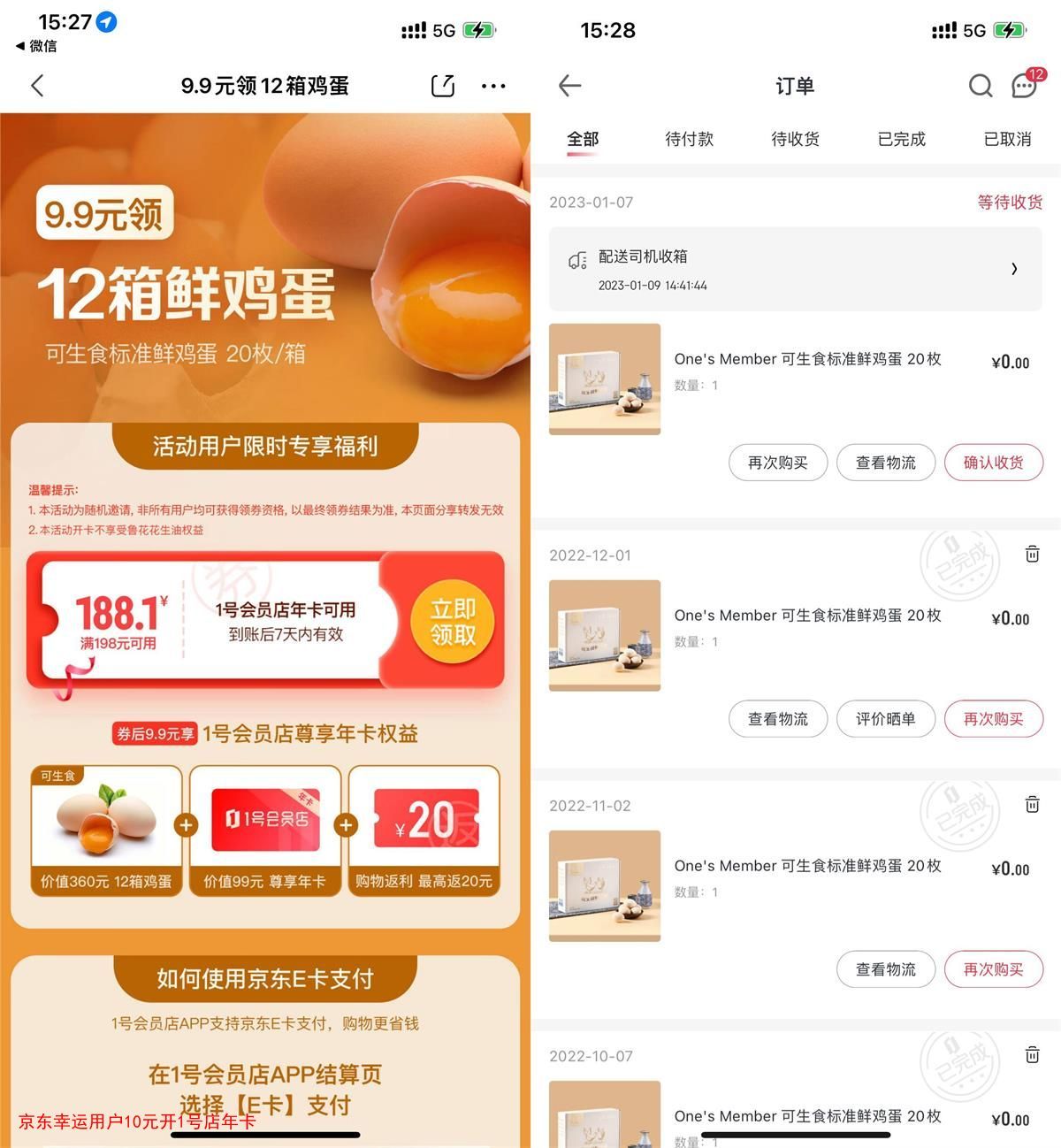 打开地址领券->如果能成功领券就代表有资格->每个月可付6元邮费领一箱(30个)鸡蛋