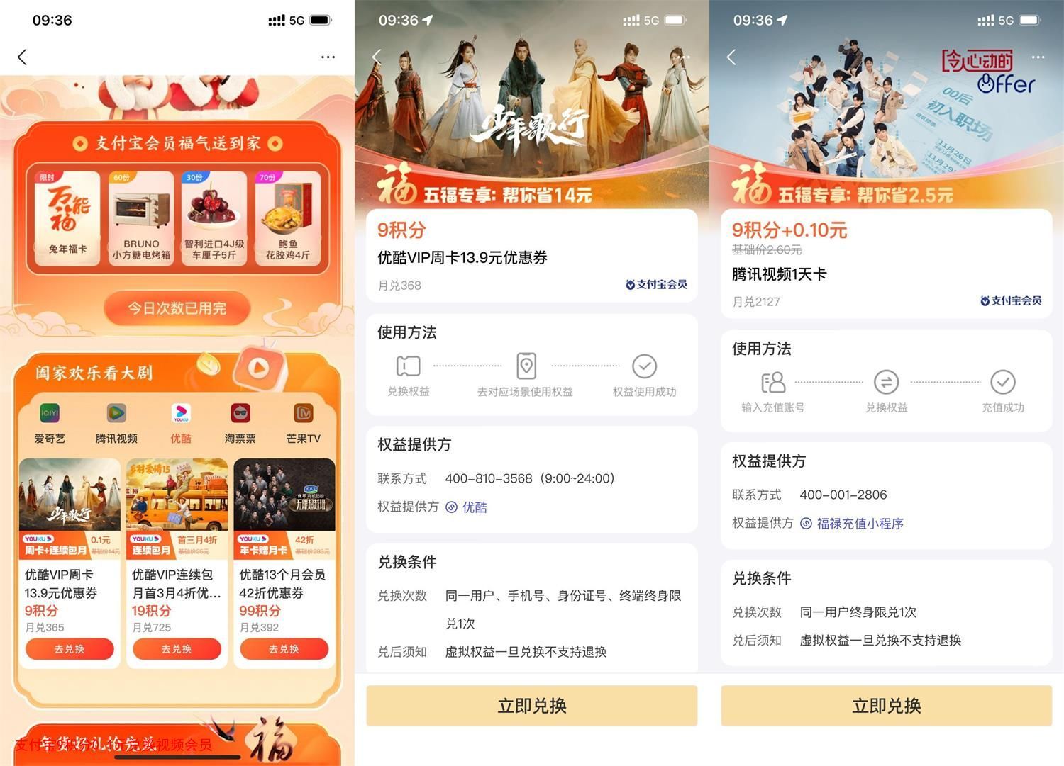 支付宝APP扫码->先用3次19积分抽万能福->下拉使用9积分+0.1元兑换腾讯视频天卡、优酷会员周卡(记得取消自动续费),9积分+1元兑换爱奇艺周卡