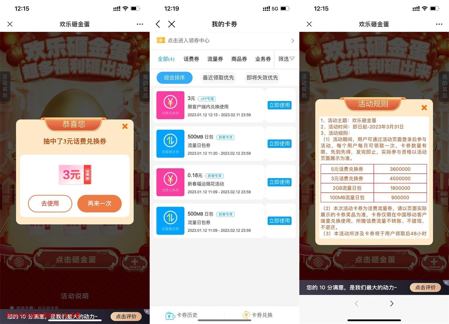 微信打开地址->直接抽3~5元话费券或流量券->在“中国移动APP-我的-卡券”中激活秒到