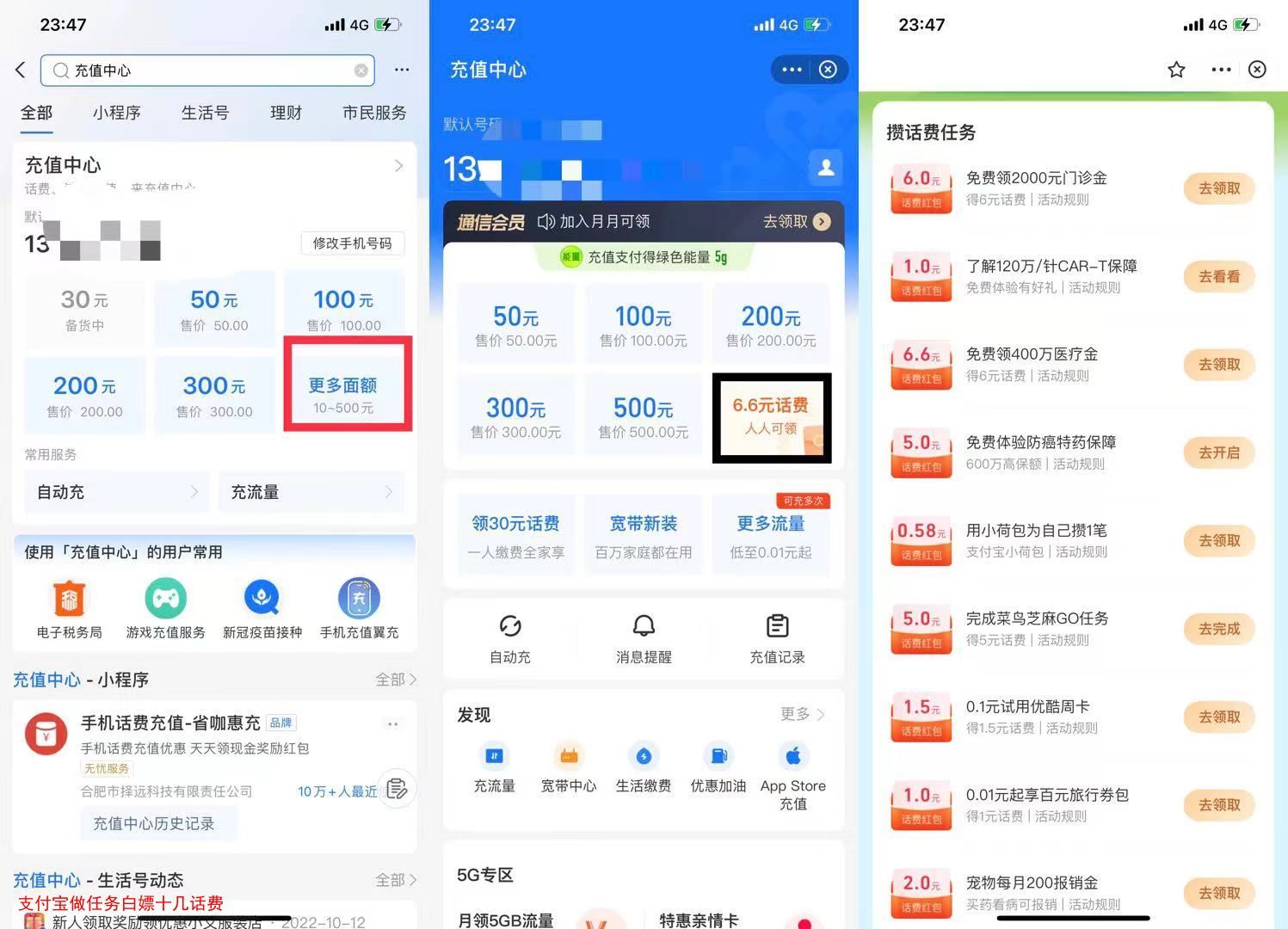 支付宝 首页充值中心 然后有这个入口的就去 做任务那些保险任务都可以做,做完之后你充值完话费了,你支付宝首页搜索蚂蚁保 然后就可以把那些都退掉,就是那些保险现在好像基本上都是人均十几块话费白嫖(如图,非人人有入口)