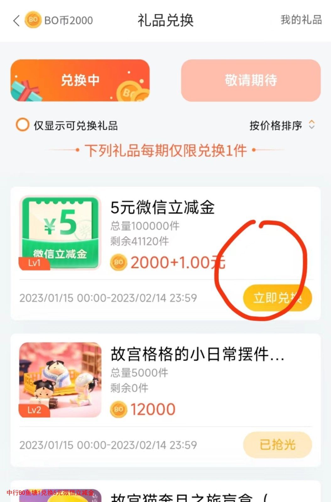 2、完成活动页面指定的任务、以及收集小鱼都可以得到BO币(每天完成浏览任务+收鱼都可以领到850个BO币),只要累积达到2000个BO币,就可以兑换5元微信立减金