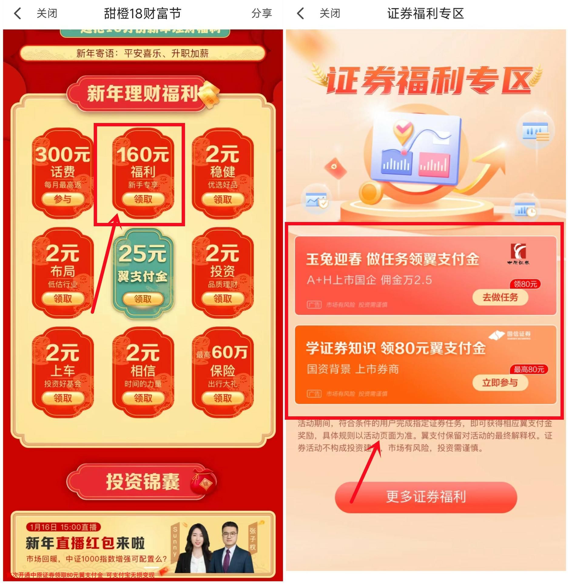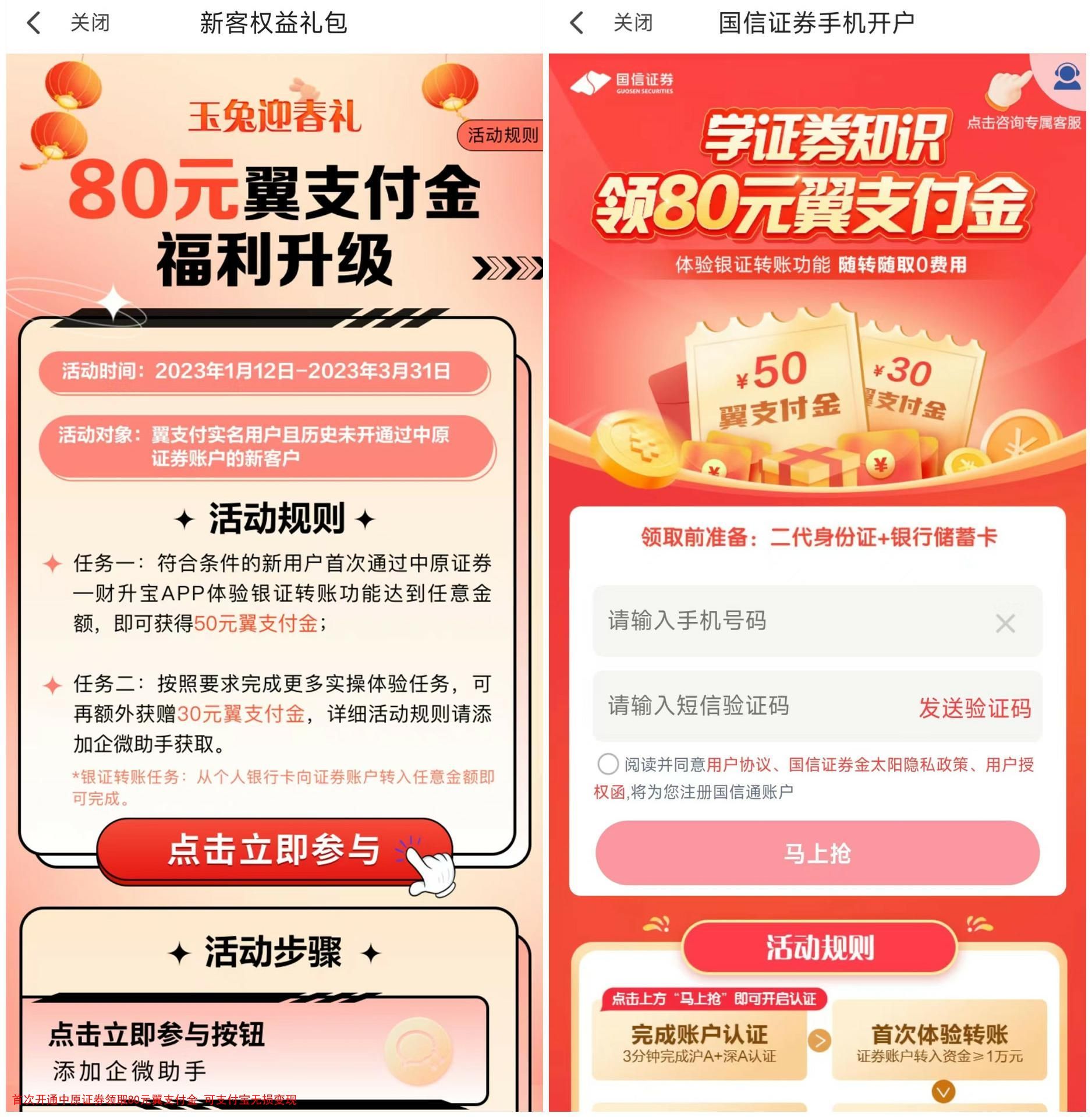 首次开通中原证券领取80元翼支付金 可支付宝无损变现